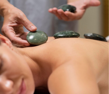 Masaje con piedras calientes que relaja profundamente los músculos.